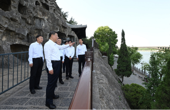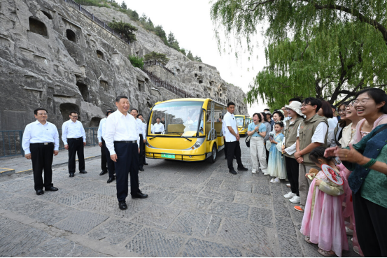 已有1500多年历史的龙门石窟,是重要的世界文化遗产。习近平来到这里,察看石窟整体布局风貌和代表性窟龛、造像,同现场的文物保护工作者亲切交流。他强调,要把这些中华文化瑰宝保护好、传承好、传播好。游客们见到总书记,都十分欣喜,纷纷向总书记问好。习近平不时同大家交流,特别鼓励小朋友们多到实地寻溯中华文化,从小树立文化自信。他指出,文旅融合前景广阔,要推动文旅产业高质量发展,真正打造成为支柱产业、民生产业、幸福产业。