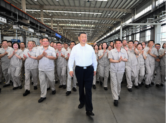 5月19日至20日,中共中央总书记、国家主席、中央军委主席习近平在河南考察。这是19日下午,习近平在洛阳轴承集团股份有限公司智能工厂考察时,同企业职工在一起。新华社记者 燕雁 摄
