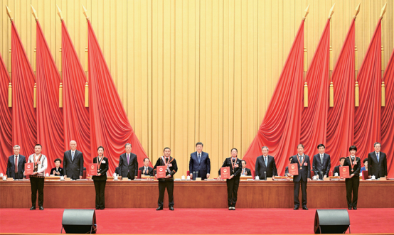 2024年9月27日,全国民族团结进步表彰大会在北京举行。这是习近平等为受表彰的模范个人和模范集体代表颁奖。 新华社记者 李学仁/摄